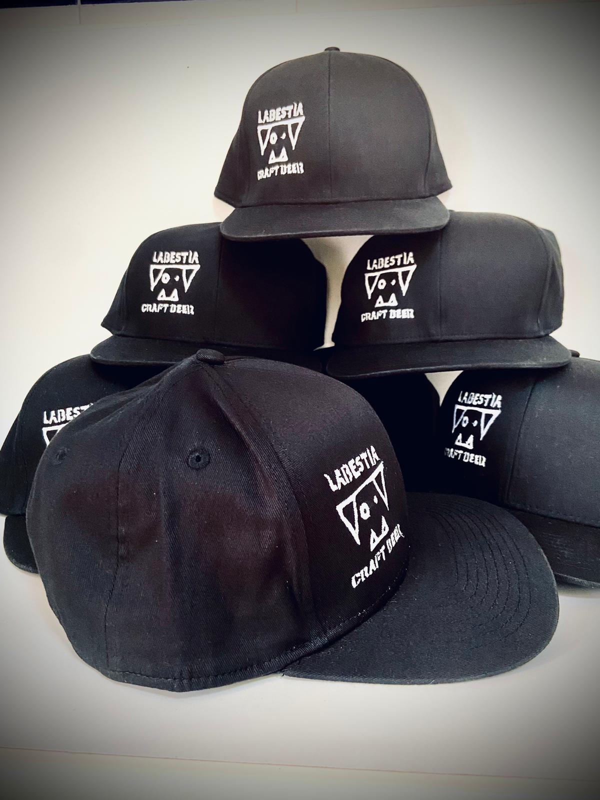 Gorra de tela ajustable negra con logo LaBestia Craft Beer bordado en blanco. Talla única.
